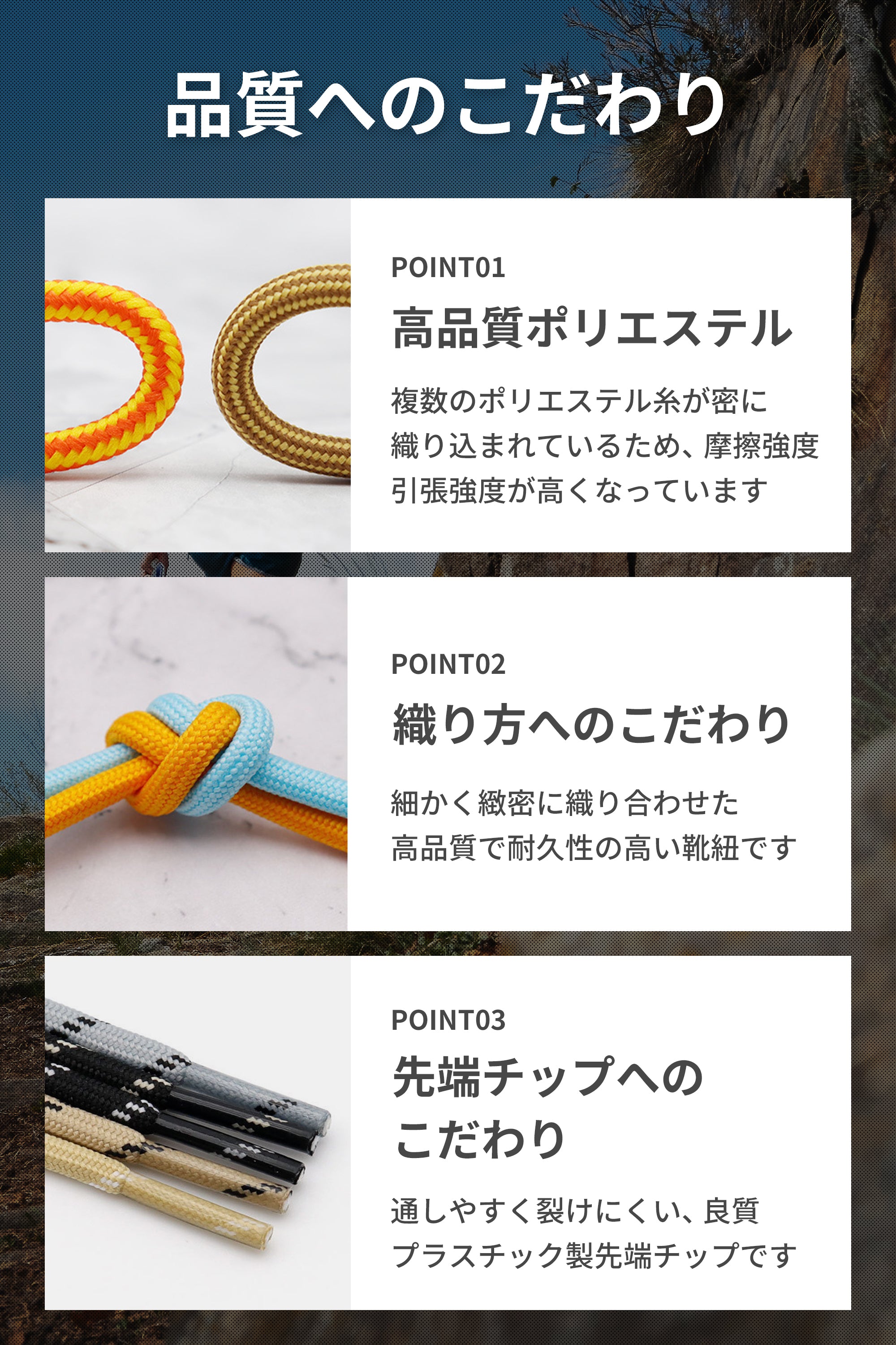 ◼️【品質へのこだわり】素材選びにこだわり抜いた高品質ポリエステルを細かく緻密に折り合わせた、高品質・高耐久の靴ひもです。